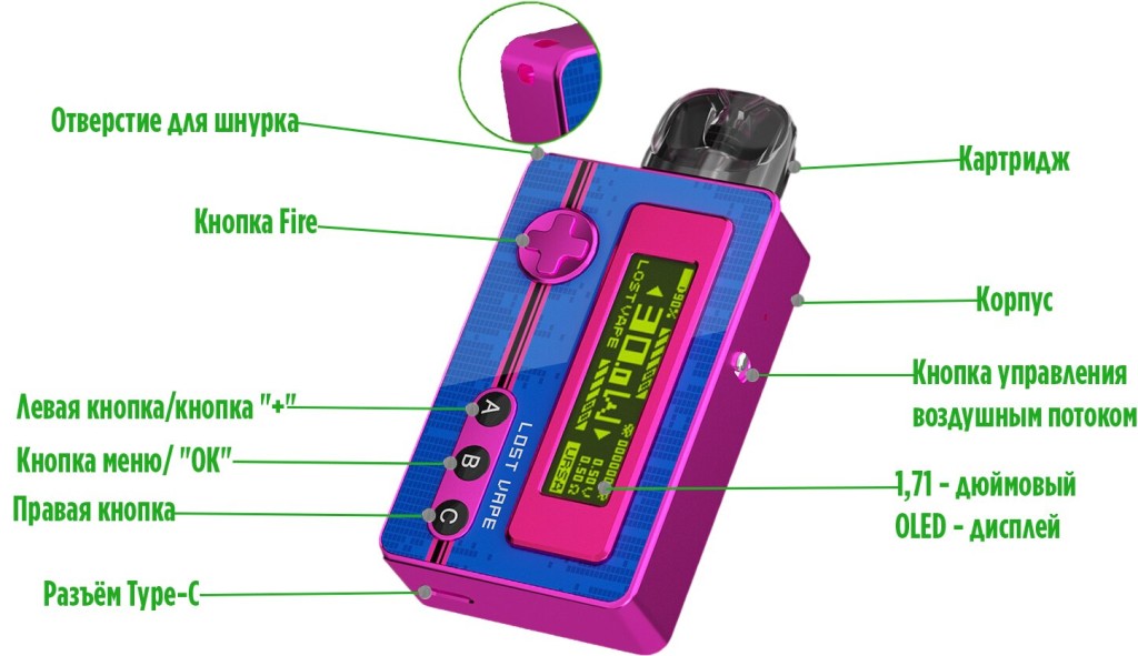 На передней панели нас ждут игры, экран в ретро стиле и кнопки управления. На задней панели световой индикатор заряда, который и сам по себе добавляет киберпанка в pod. Широкий ланьярд, выполненный в том же стиле, позволяет носить устройство с собой на шее.